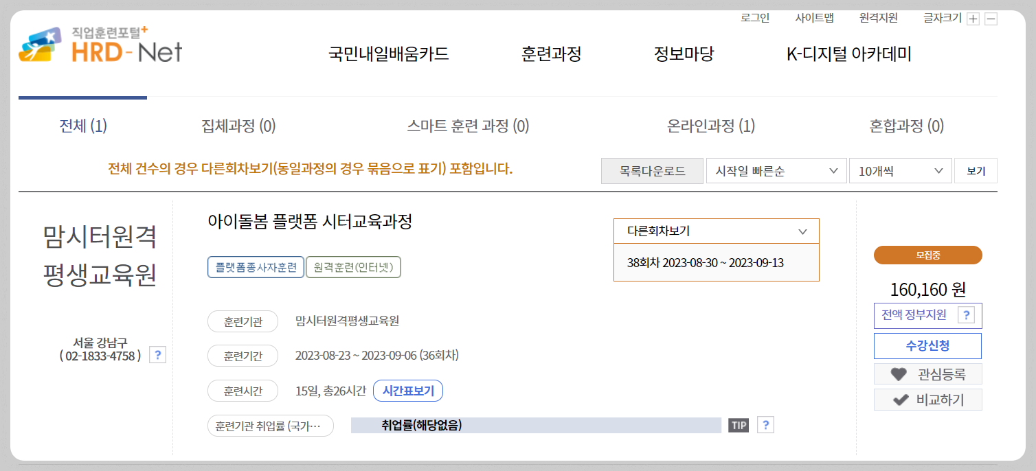 고용노동부 직업훈련포털 hrd-Net으로 접속하여 시터교육을 검색해 줍니다.